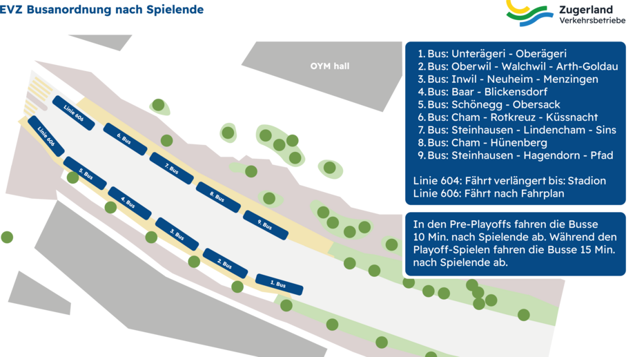 Wir sind stolze Mobilitätspartnerin vom EVZ und setzen uns dafür ein, die Zuger Fans so schnell und einfach wie möglich in die OYM hall zu bringen. Zuger Fans mit einem Einzeleintritt oder einem Saisonabo fahren ab 3 Stunden vor Spielbeginn und bis 2 Stunden nach dem EVZ-Heimspiel gratis mit der ZVB, (2. Klasse) innerhalb des Tarifverbunds Zug mit. Ausserdem stehen jeweils nach den EVZ-Spielen mehrere Extrabusse der ZVB gleich vor dem Stadion, nähe Bushaltestelle bereit, um in die verschiedenen Gemeinden zu fahren. Abfahrt der Busse 10 Min. nach Spielende, während den Play-Offs 15 Minuten nach Spielende.