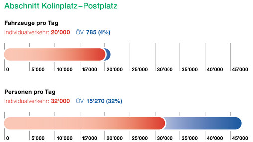 An einem Tag verkehren auf dem Abschnitt Kolinplatz-Postplatz 20'000 Fahrzeuge des Individualverkehrs und 785 ZVB-Busse. Diese transportieren 32% der Personen.